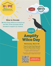 Amplify Wilco Day is the biggest giving day in Central Texas. Hope Alliance has partnered with four local establishments on March 4, 2026. All proceeds will benefit Hope Alliance's mission of delivering hope, healing, and prevention for survivors of domestic violence.